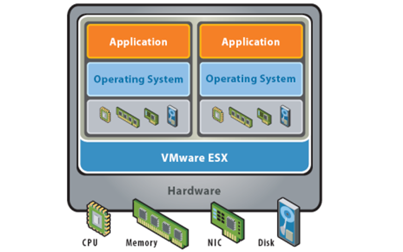 VMware ESX and VMware ESXi install directly on the server hardware, inserting a robust virtualization layer between the hardware and the operating system. VMware ESX and ESXi partition a physical server into multiple secure and portable virtual machines that can run side by side on the same physical server. Each virtual machine represents a complete system—with processors, memory,networking, storage and BIOS—so that an operating system and software applications can be installed and run in the virtual machine without any modification. Virtual machines are also completely isolated from each other by the virtualization layer, thus preventing a crash or configuration error in one virtual machine from affecting the others. Sharing the physical server resources among a number of virtual machines increases hardware utilization and dramatically decreases capital costs. The bare-metal architecture gives VMware ESX and ESXi complete control over the server resources allocated to each virtual machine and provides for near-native virtual machine performance and enterprise-class scalability. VMware ESX and ESXi provide virtual machines with built-in high availability, resource management and security features to deliver improved service levels to software applications than static physical environments.